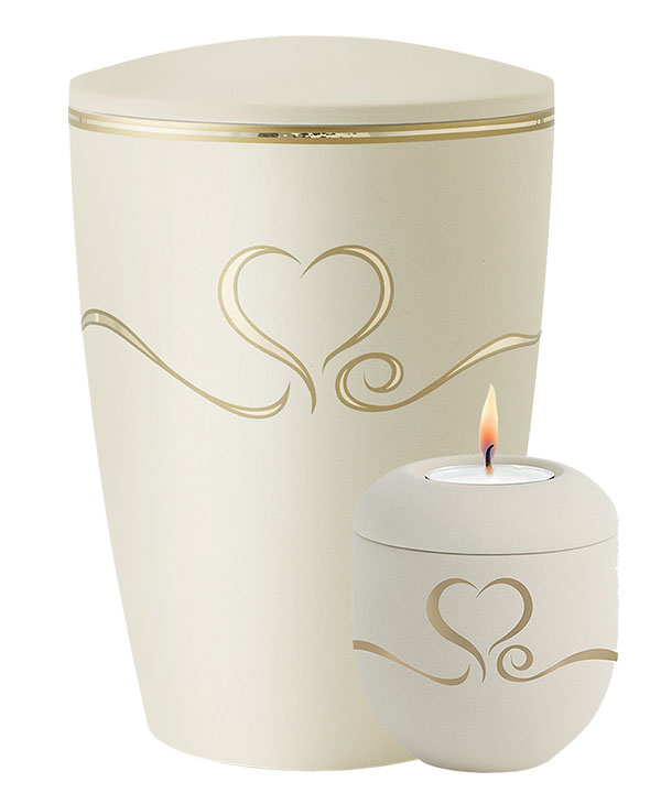 Urnenset bestehend aus Schmuckurne 2/370021 (Naturstoff) und Gedenklicht P370021L (Porzellan)